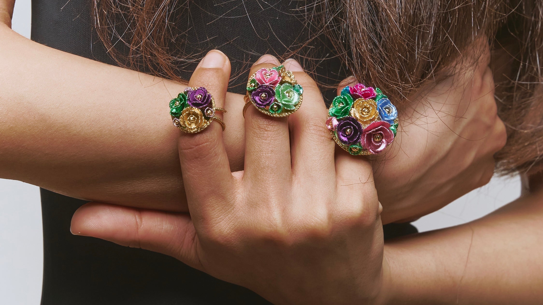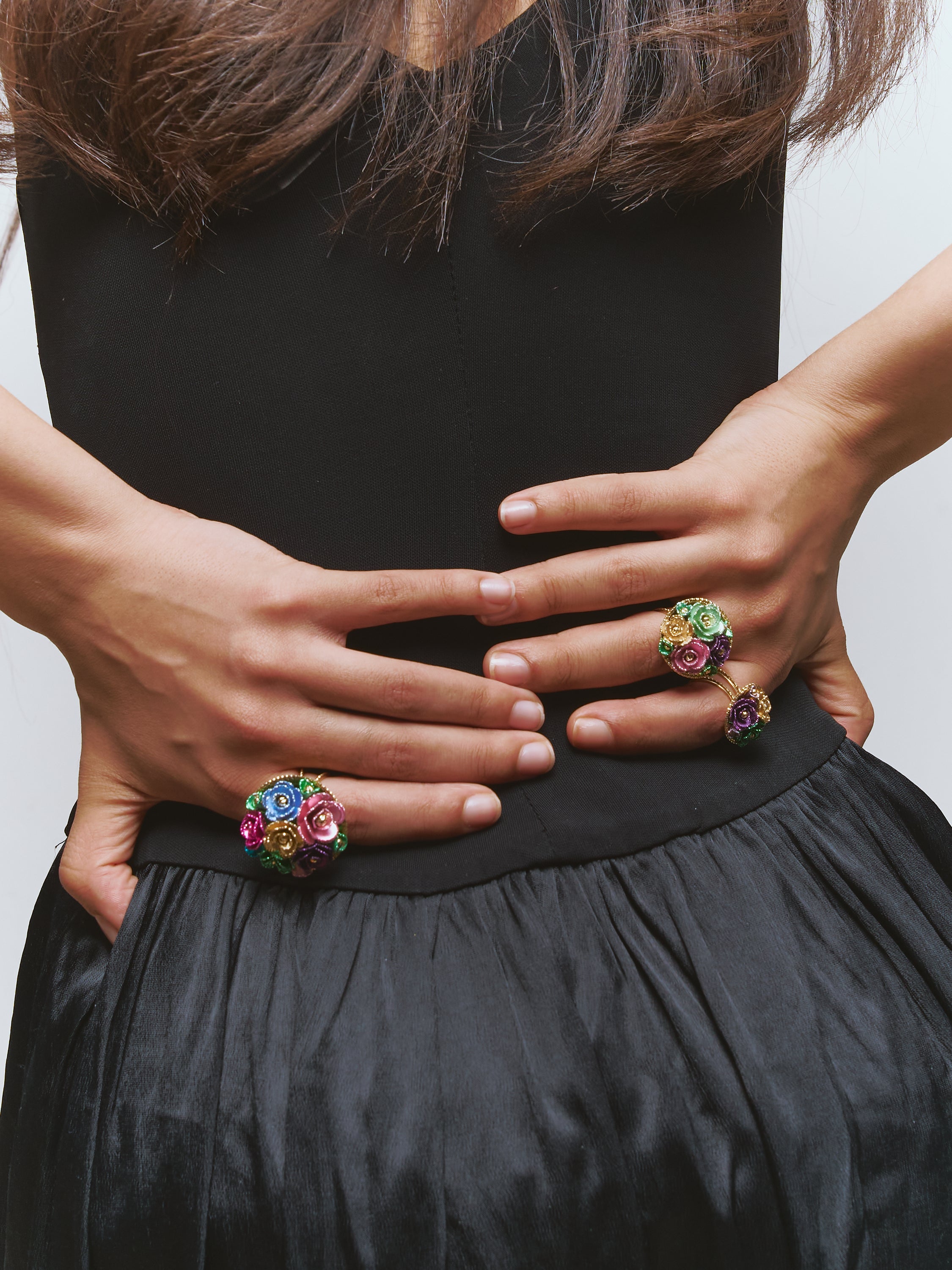 A delicate explosion of colors and craftsmanship, the Bouquet ring by Caoro brings together hand-crafted enamel flowers in vibrant shades, set on warm gold tones.