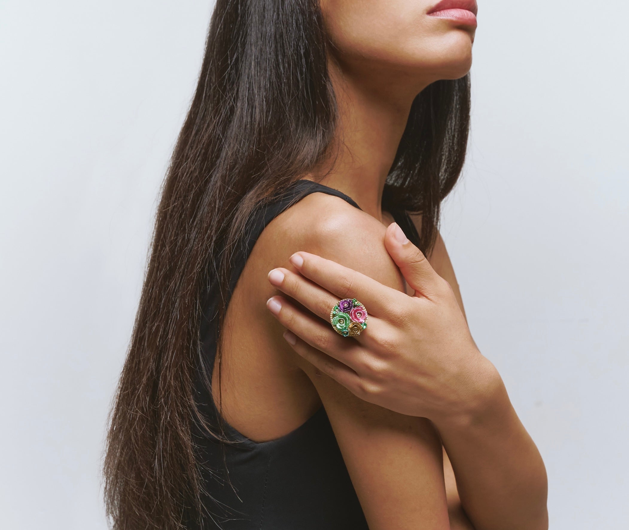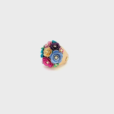A delicate explosion of colors and craftsmanship, the Bouquet ring by Caoro brings together hand-crafted enamel flowers in vibrant shades, set on warm gold tones.