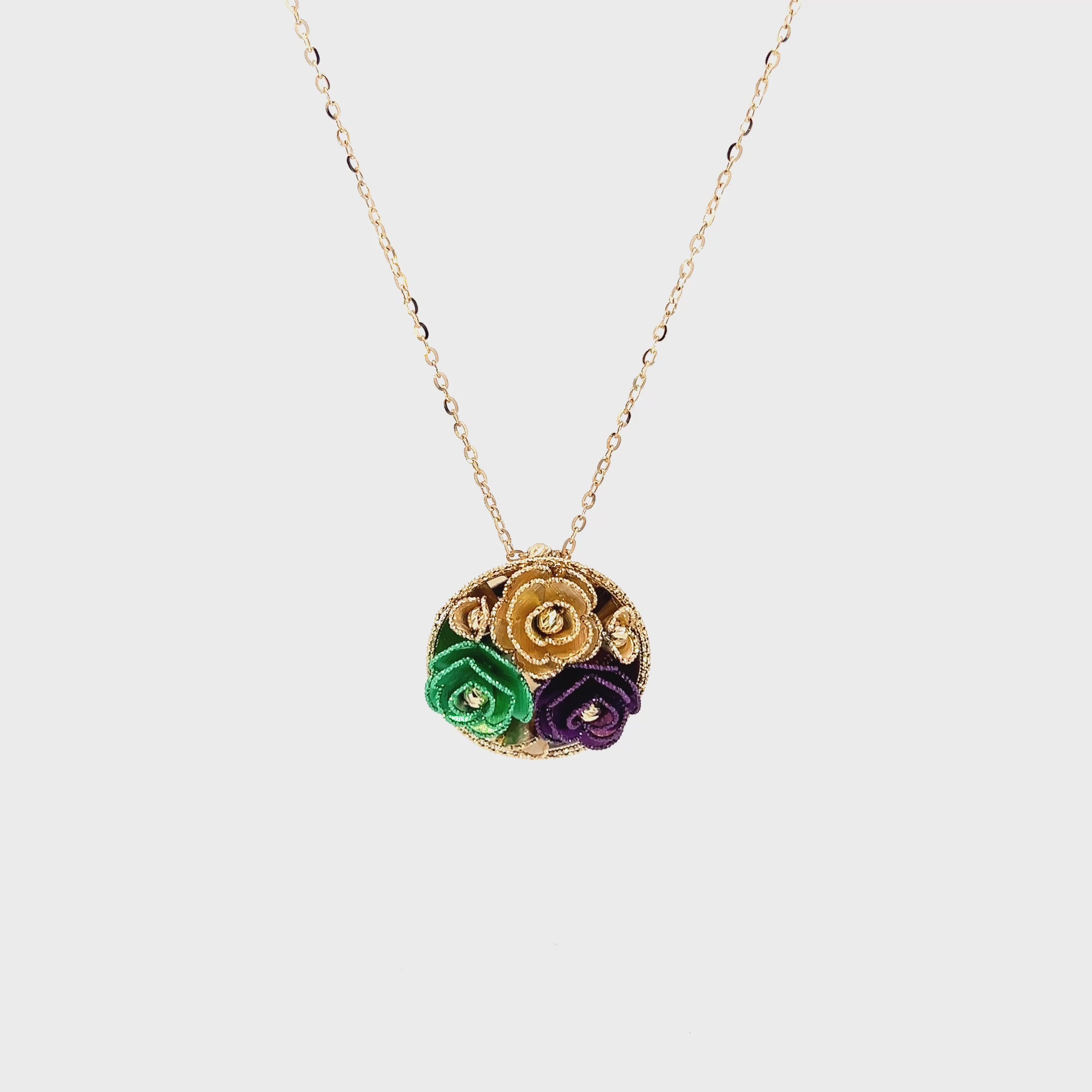 An 18K gold necklace featuring Caoro’s signature colorful flower. A clean and distinctive design, representing the brand.