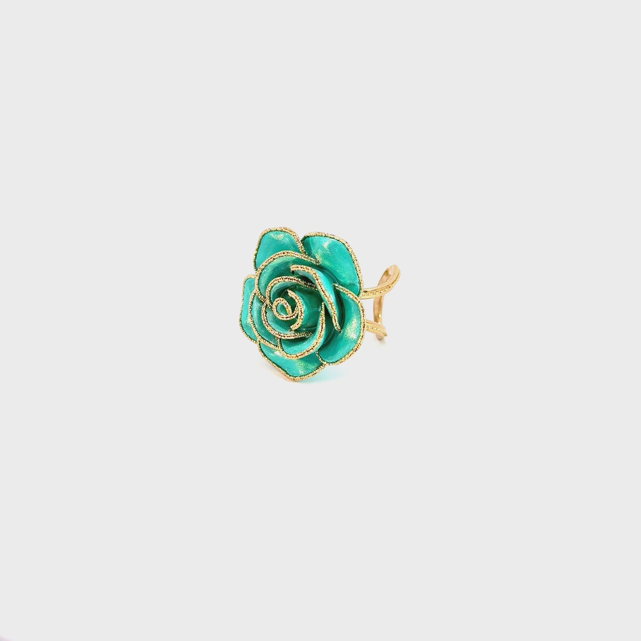 A delicate large 18K gold ring shaped like a blooming rose, available in several shades. Its unique design lets you add your favorite fragrance inside the flower, releasing a subtle scent with every movement, a jewel that blossoms with your essence.